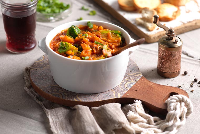 Incorporar el zapallo, el repollo, el puré de tomates, 1 taza de caldo y laurel. Cocinar hasta que los vegetales pierdan su rigidez, agregar las arvejas, repollitos y resto de los condimentos.