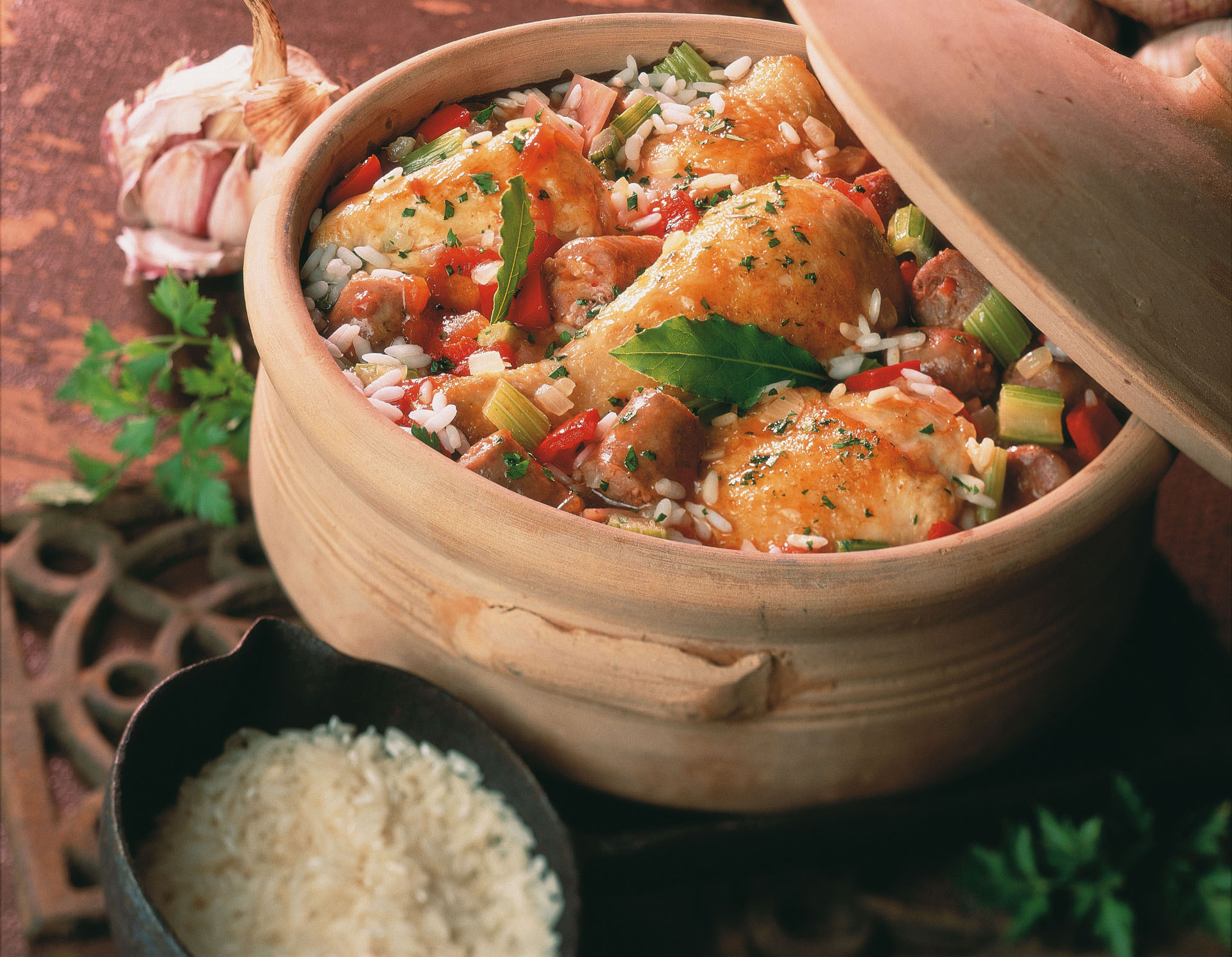 Calentar el Aceite Natura en una cacerola o cazuela de barro y dorar de a pocas por vez las presas de pollo de todos lados, retirar el pollo y reservar. Dorar los trocitos de salchicha. Reservar junto con el pollo. Agregar a la cazuela la cebolla, el apio y el ajo y cocinar hasta que estén transparentes alrededor de 4 minutos. Espolvorear con el pimentón y colocar el pollo y la salchicha junto con el jamón, las hojas de laurel y el caldo.