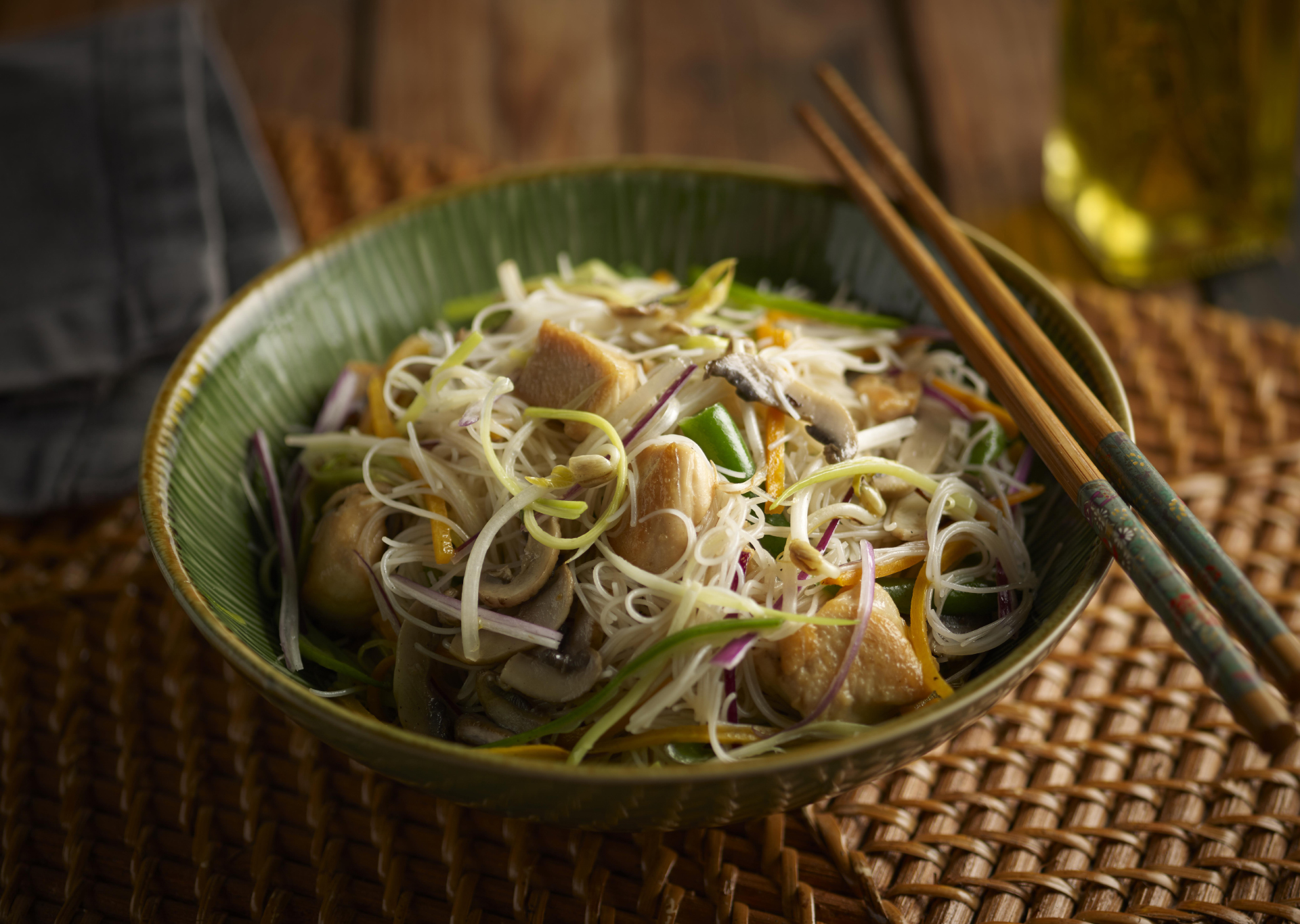 Agregar los fideos y los cubos de pollo a la sartén, por ultimo añadir el almidón disuelto en el jerez. Dejar cocinar unos minutos hasta que el pollo esté listo, retirar del fuego y servir inmediatamente.