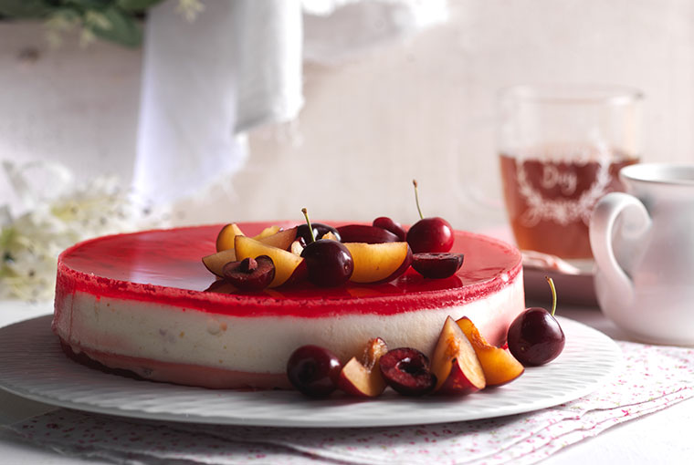 Para la cobertura, colocar en un recipiente la gelatina de frutillas con la mitad del agua indicada en el envase. Calentar a Baño María, dejar enfriar a punto jarabe espeso y cubrir la preparación anterior, decorar con las frutillas a gusto. Llevar a la heladera durante 3-4 horas, retirar el molde y servir.