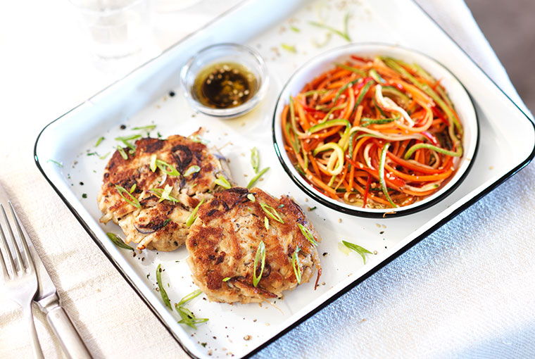 En un bowl unir el pollo desmenuzado con la cebolla, la salsa de soja, el huevo y el pan rallado, salpimentar a gusto.