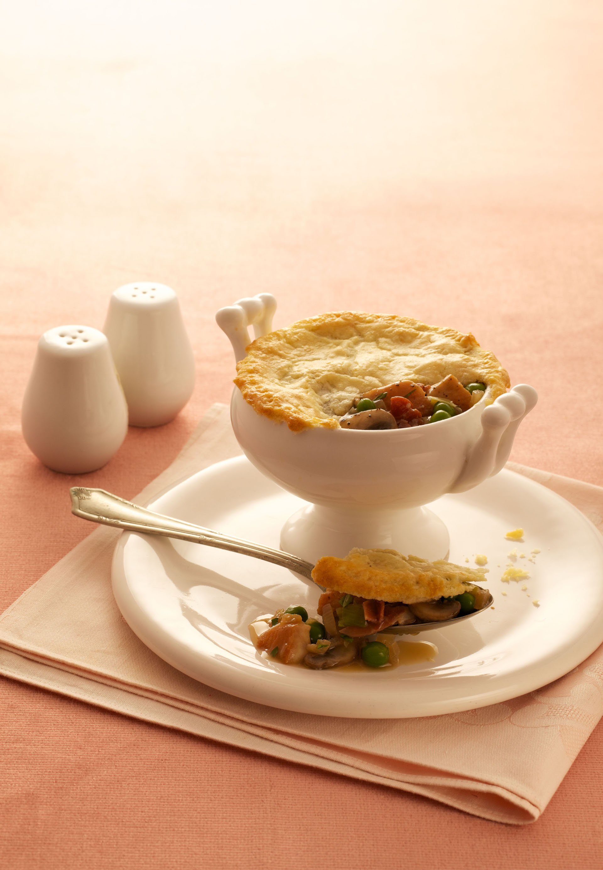 Retirar la masa de la heladera, estirarla dejándola fina y cortarla en discos de un centímetro más grandes que las bocas de las cazuelitas. Tapar el relleno de las cazuelas con un disco de masa, hundir ligeramente los bordes y presionarlos, para unirlos bien, con un tenedor enharinado. Realizar 3 ó 4 incisiones a la tapa de cada pastel, (para que se elimine el exceso de vapor). Pintar la masa con huevo batido y cocinar en horno caliente, hasta que estén doradas y la masa bien crujiente.