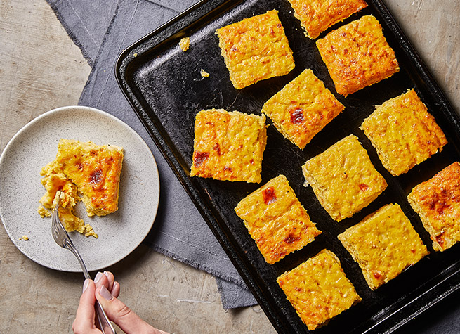 Aparte, calentar en una sartén el Aceite de Oliva Clásico Natura, agregar las cebollas picadas hasta que transparenten. Incorporarles el choclo reservado, mezclar. Añadir los huevos y la leche y mezclar hasta integrar bien. Salpimentar a gusto e incorporar el queso fresco en cubos. Verter la mezcla en una fuente apta para horno previamente lubricada con abundante Rocío Vegetal Oliva Natura.