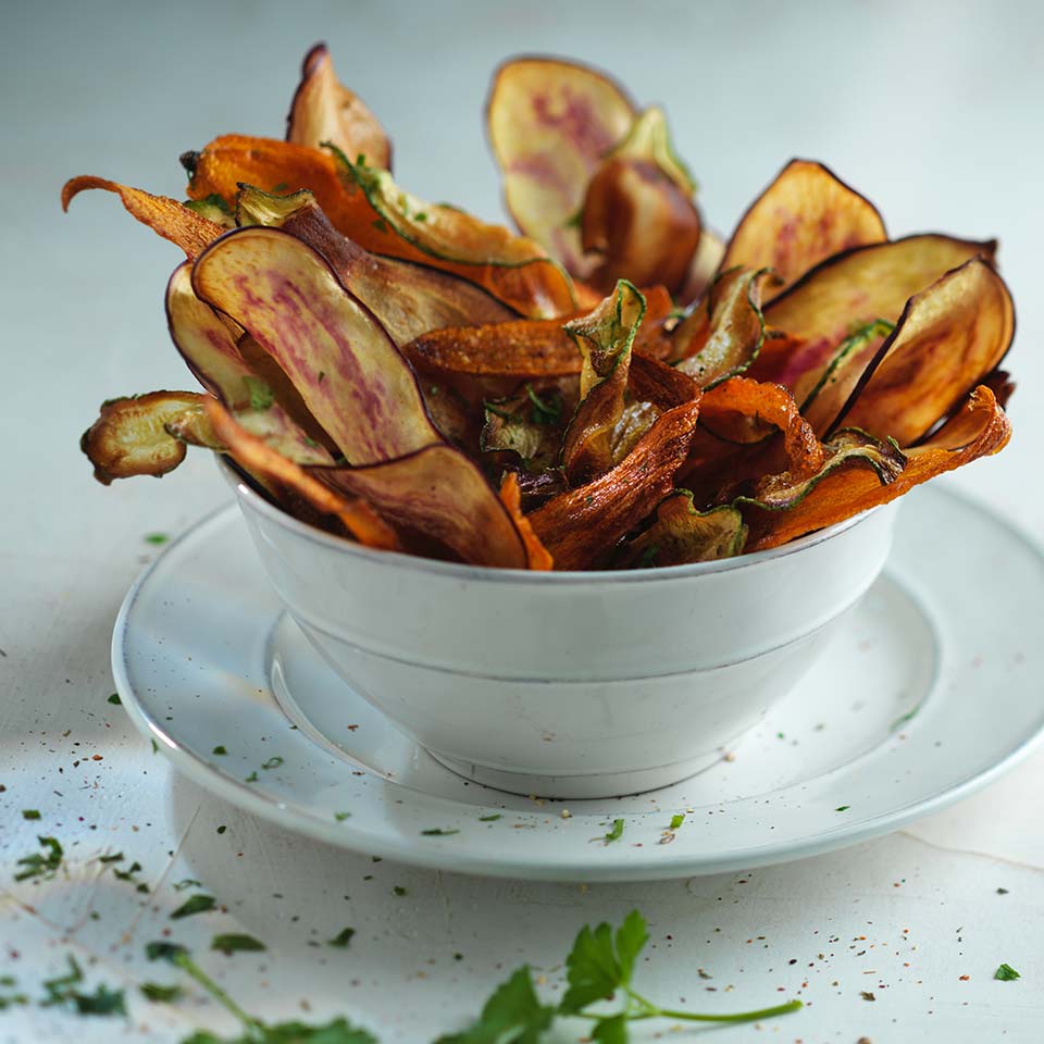 Lavar y secar muy bien las verduras. Despuntar el zucchini, la berenjena y la zanahoria. Pelar la batata y raspar o pelar la zanahoria. Con ayuda de una mandolina o pela verduras cortar los vegetales en láminas finas.