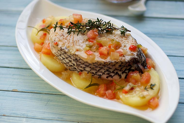 Colocar sobre las verduras las rodajas de pescado y cocinarlas tres minutos de ambos lados. Sazonar, añadir las hierbas y cubrir con parte del caldo.