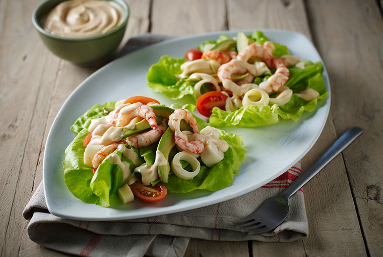 Colocar sobre cada plato 2 o 3 hojas de lechuga. Acomodar sobre éstas los palmitos, los tomates y las paltas. Añadir una cucharada abundante de la mezcla de mayonesa y disponer encima algunos camarones. Por último decorar con Salsa Golf Natura.