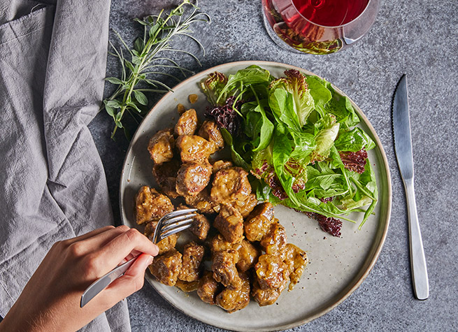 Una vez cocido, retirar y servir el cordero acompañado por la ensalada de verdes mixtos, aderezada con un hilo de Aceite de Oliva Selección Natura, una pizca de sal y limón.