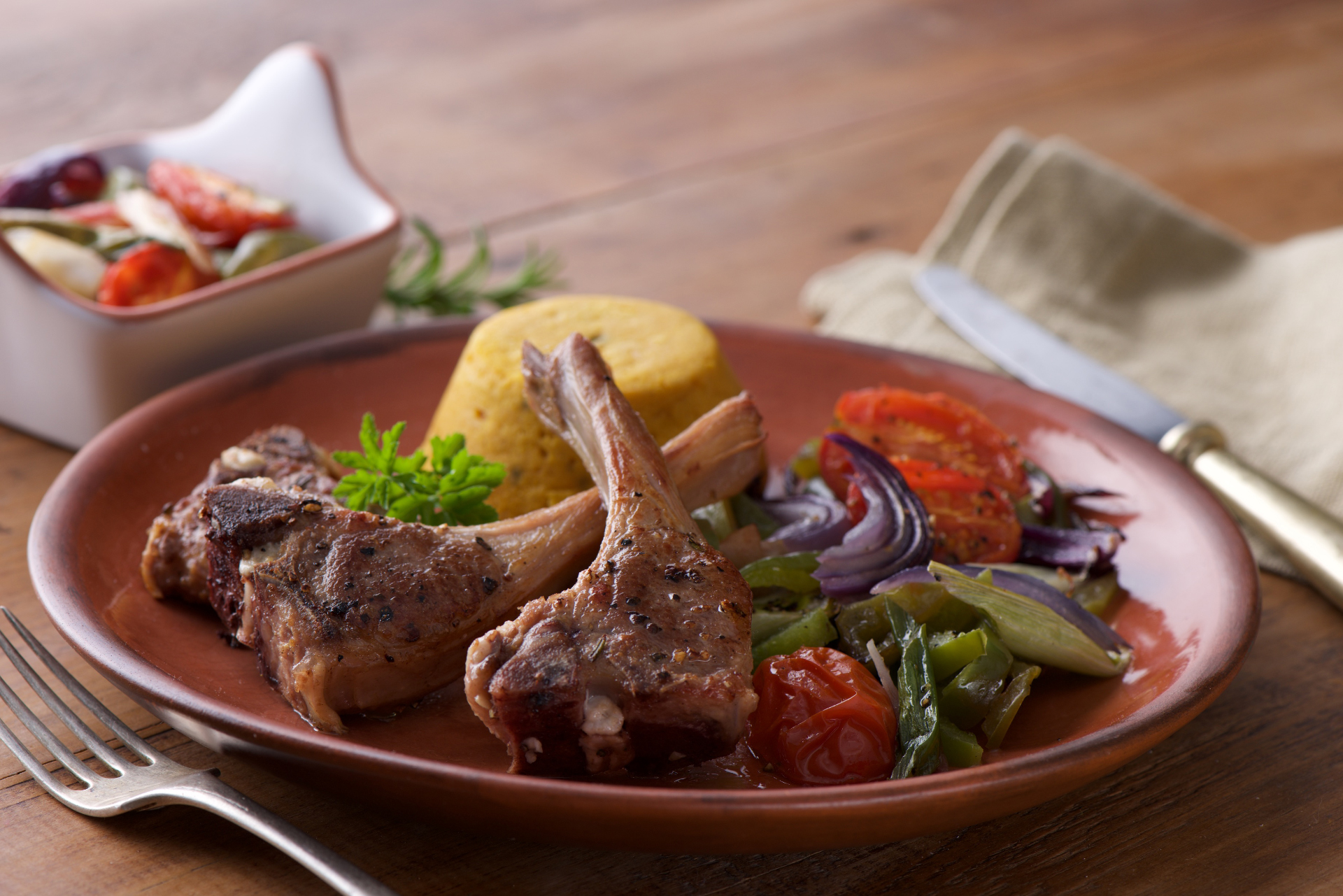 Colocar en cada plato tres costillas de cordero acompañadas de un puñado de los vegetales asados y una porción del flan de zanahorias. Salsear las costillas con el jugo de cocción y servir.