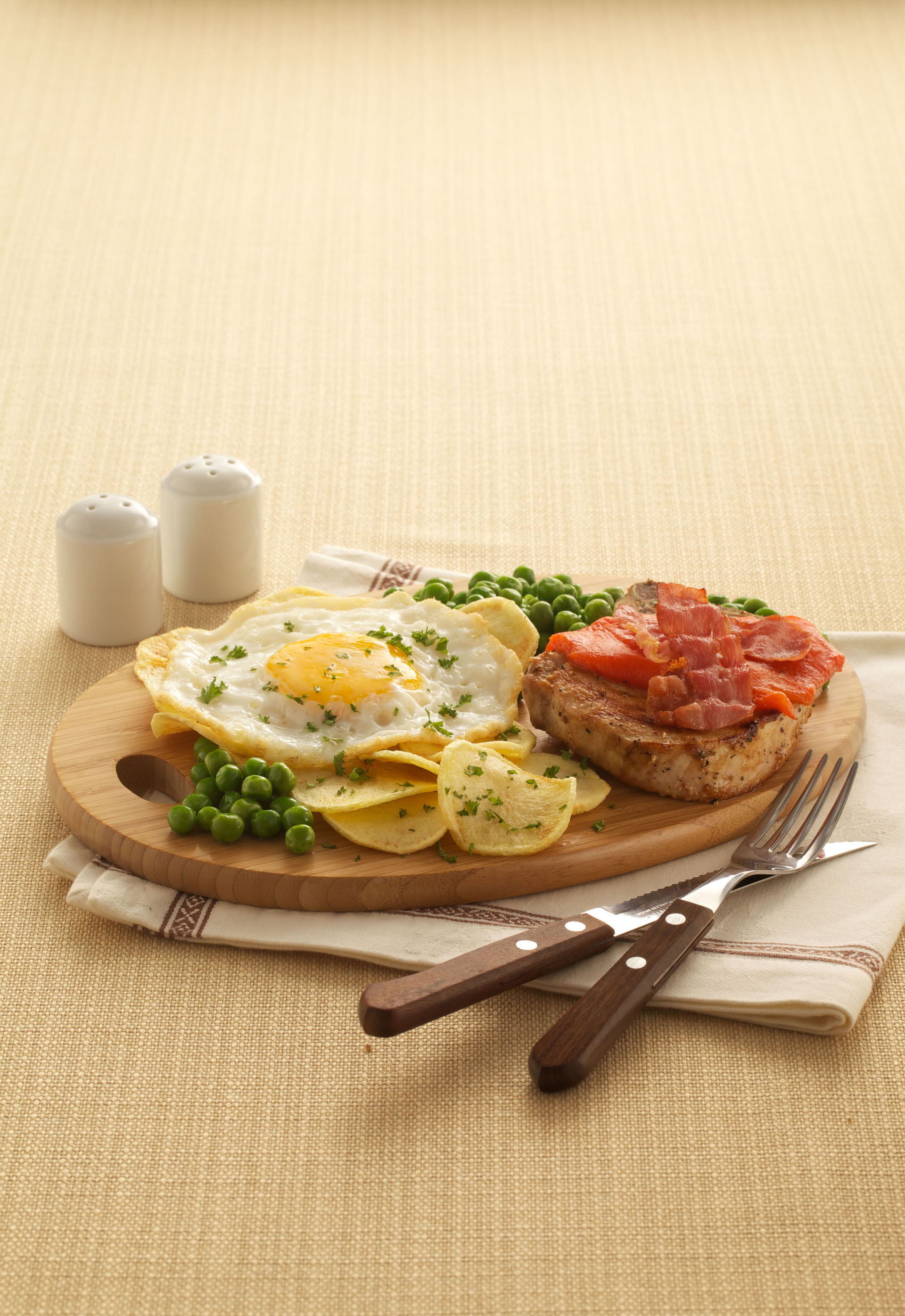 Hacer los huevos fritos en una sartén antiadherente lubricada con abundante Rocío Vegetal Natura. En una bifera cocinar las costillitas de cerdo con una pizca de sal, y al darlos vuelta ya cocidos poner un morrón rojo sobre cada costillita. Dejar cocinar la carne mientras toma contacto con el morrón. Retirar y disponer en una fuente, servir con la panceta y los morrones.