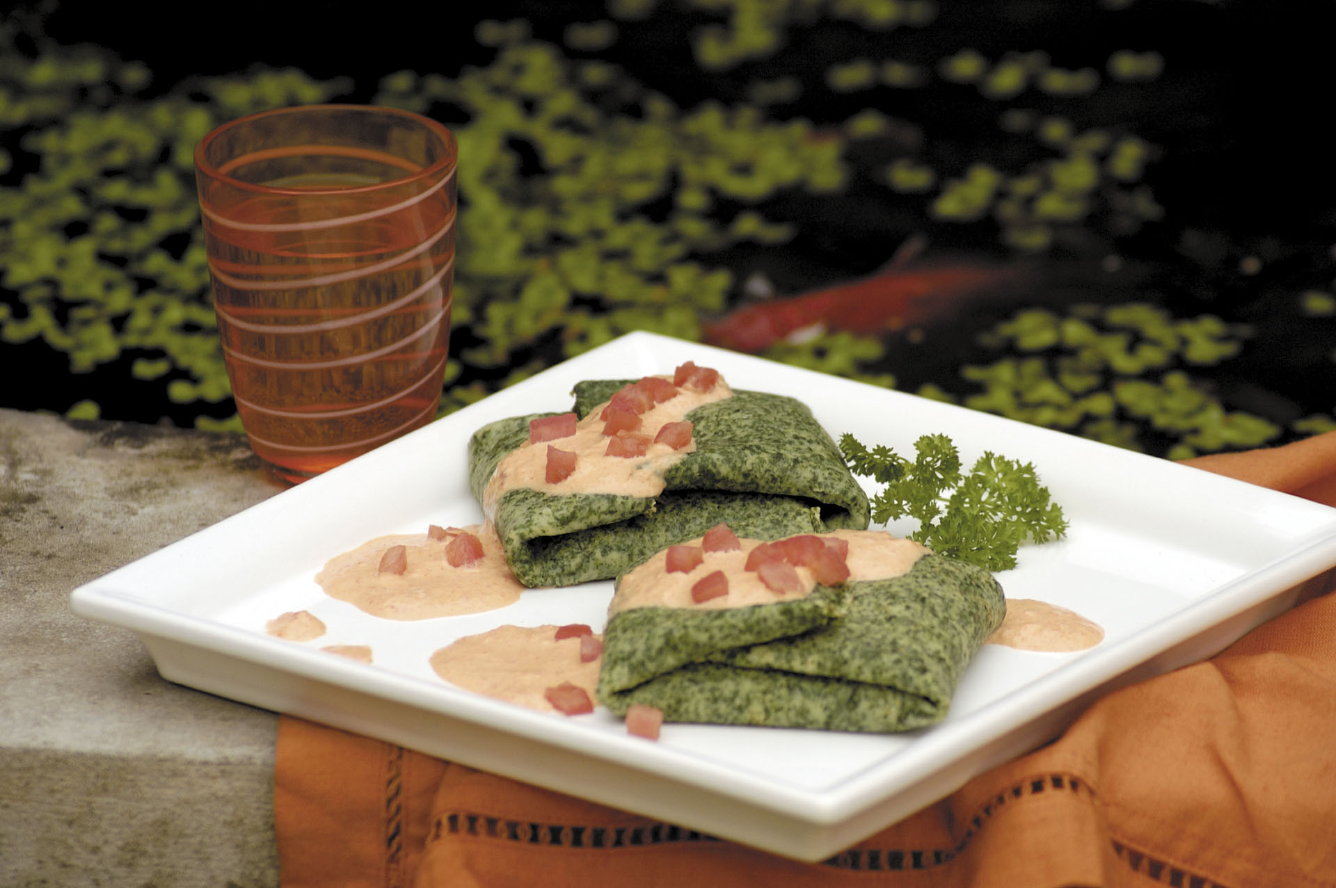 Disponer 2 a 3 crepes en cada plato y cubrir con la salsa que se habrá preparado licuando previamente la Mayonesa Natura con el morrón asado.