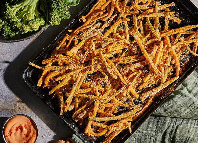Lavar los tallos de brócoli, cortarlos en bastoncitos finos y pasarlos 5 minutos por agua salada hirviendo, retirar escurrir muy bien y pasarlos, aún húmedos, por la mezcla de fécula, pan rallado y condimentos. Distribuirlos sobre una placa para horno lubricada con Rocío Vegetal Oliva Natura, rociarlos con un hilo de Aceite de Oliva Intenso Natura y llevar a horno fuerte durante 15-20 minutos hasta dorar.