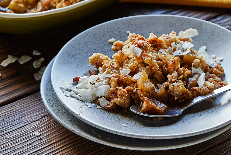 Lubricar un molde de 15x15 cm. con Rocío Vegetal Natura, disponer los cubos de manzana azucarada y esparcir el crocante cubriendo bien la fruta.