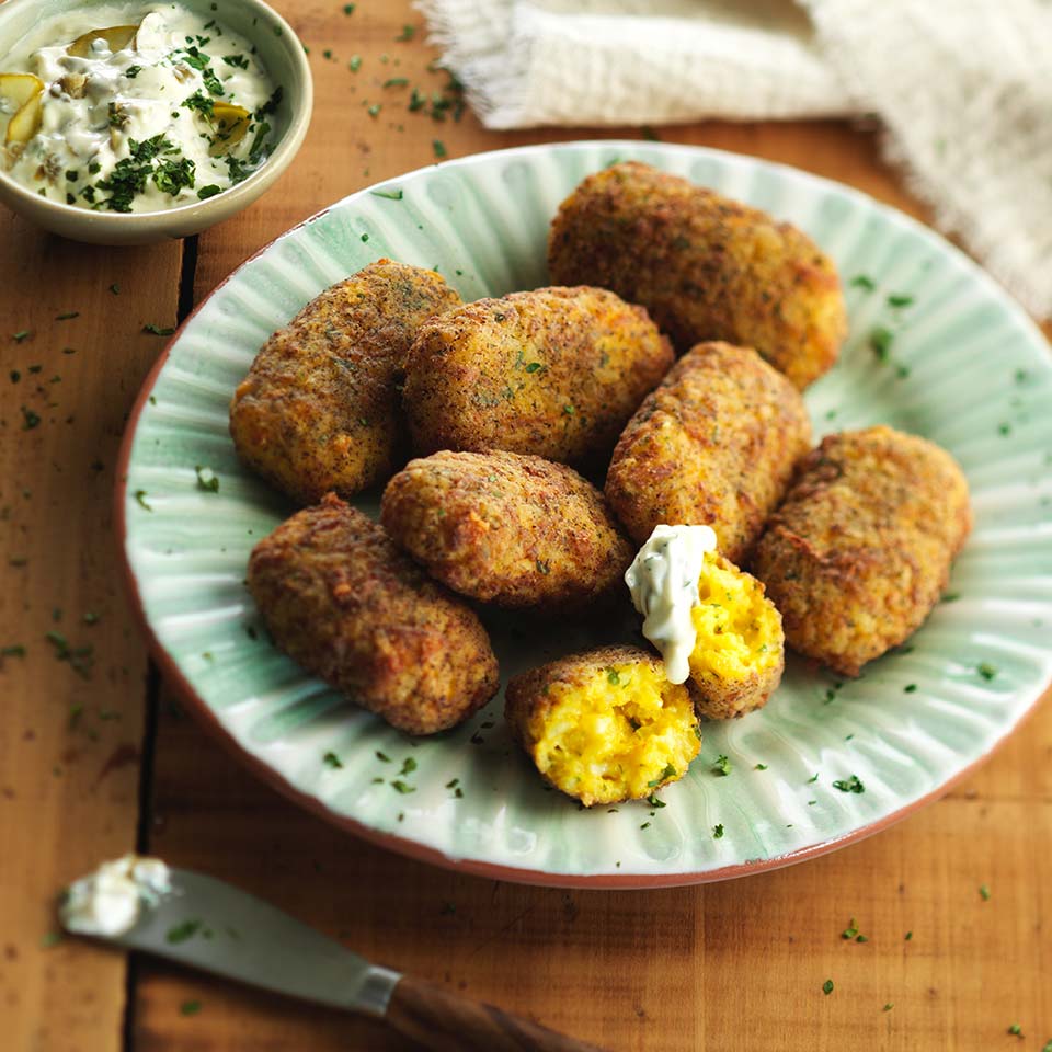 Con la ayuda de las manos húmedas formar las croquetas, pasarlas por pan rallado y freír en una sartén con abundante Aceite de Girasol Natura bien caliente. Una vez doradas retirar y disponer sobre papel absorbente. Servir calientes acompañadas del aderezo especial.