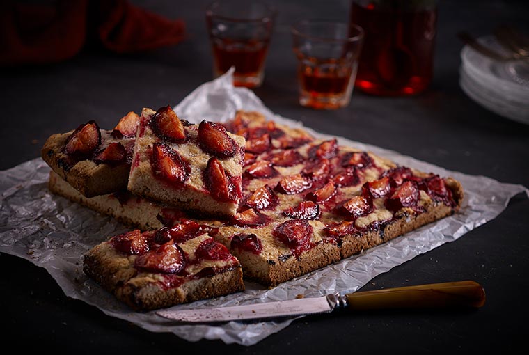 Forrar una placa rectangular para horno con papel manteca y luego rociarla con Rocío Vegetal Natura. Volcar la preparación anterior y disponer encima las ciruelas peladas en pequeños gajos. Llevar a horno medio durante 45 minutos o hasta que introduciendo un palillo de madera o cuchillo, este salga seco. Retirar, dejar enfriar y servir.