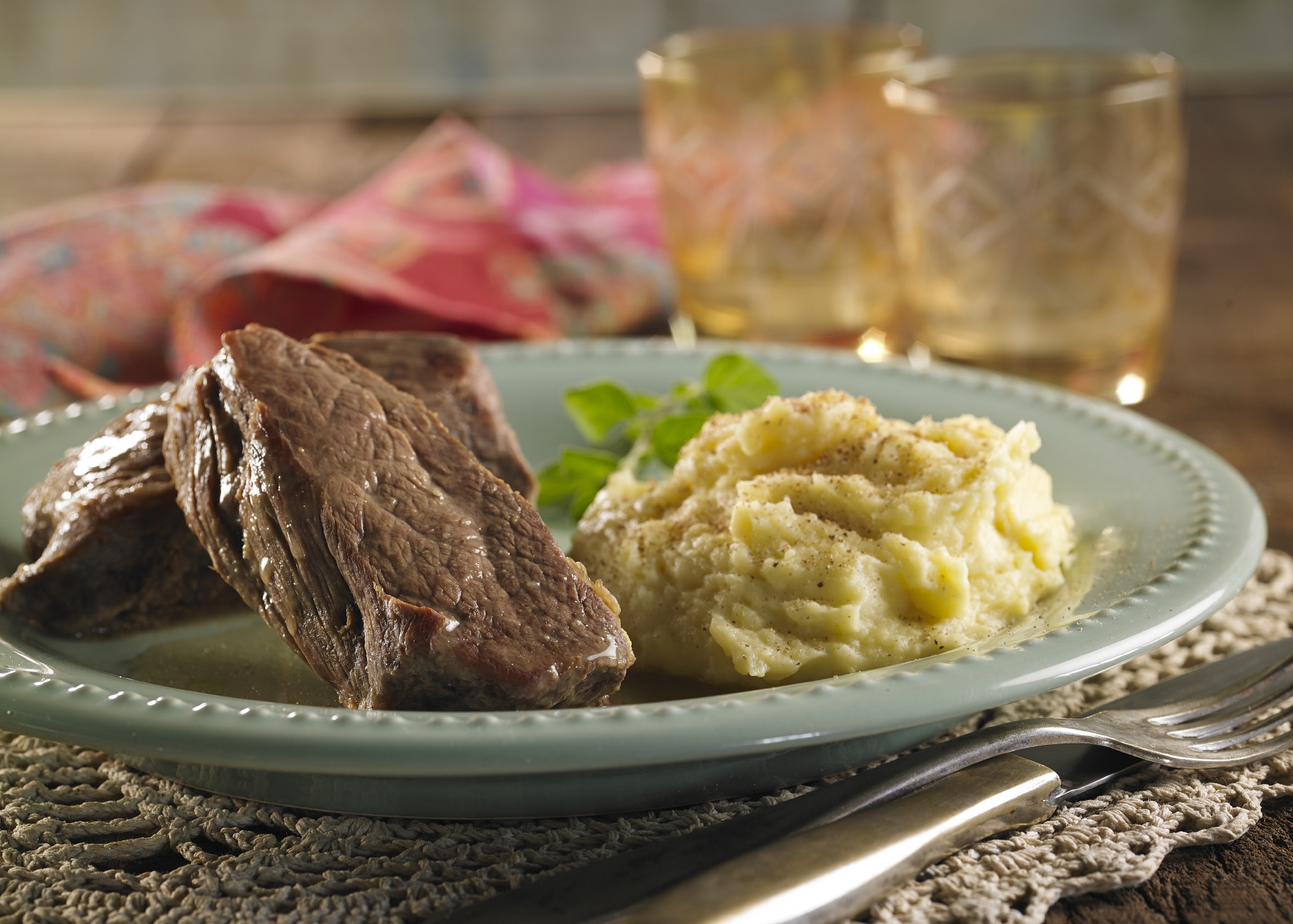 Cuadril en salsa de cebollas con puré de papas y mayonesa