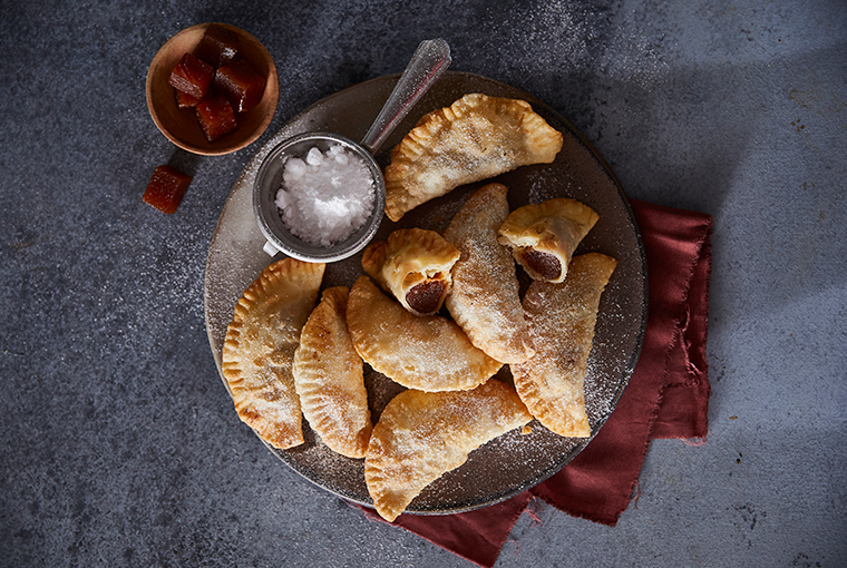 Dividir la masa en 18 bollitos, con la ayuda de un palo de amasar estirar cada bollo sobre una mesada enharinada. Distribuir sobre cada tapa una cucharada de membrillo y otra de queso, cerrar las empanadas, sellar los extremos mojándolos con unas gotas de agua y presionar con un tenedor para que no se abran.