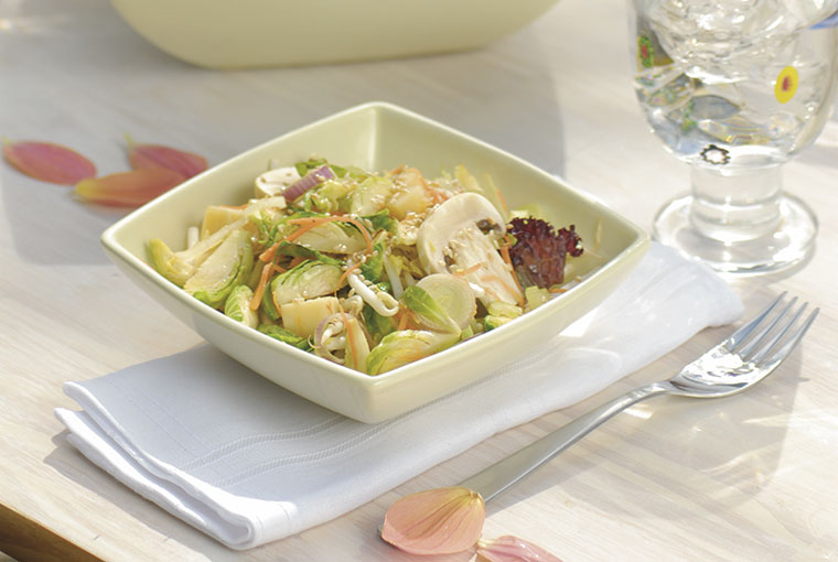 Calentar una sartén o Wok y verter el Aceite Oliva Virgen Extra Natura, agregar los repollitos de Bruselas y rehogarlos ligeramente (deben quedar crujientes), luego entibiarlos, colocarlas en un bol, agregar el resto de los ingredientes (excepto las semillas) y condimentar.