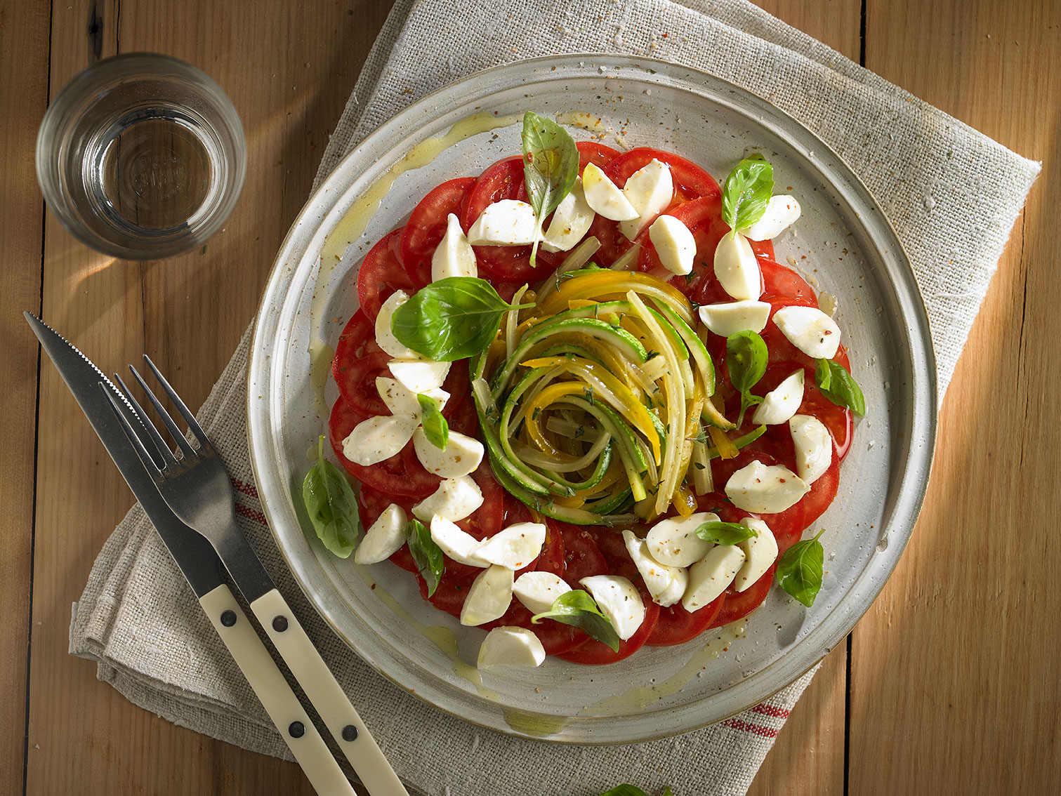 Disponer en platos individuales alternando las fetas de queso y tomate en forma de círculo. Acompañar con las verduras salteadas al tomillo en el centro. Rociar cada plato con una cucharada de Aceite de Oliva Selección Natura. Decorar con hojas de albahaca.