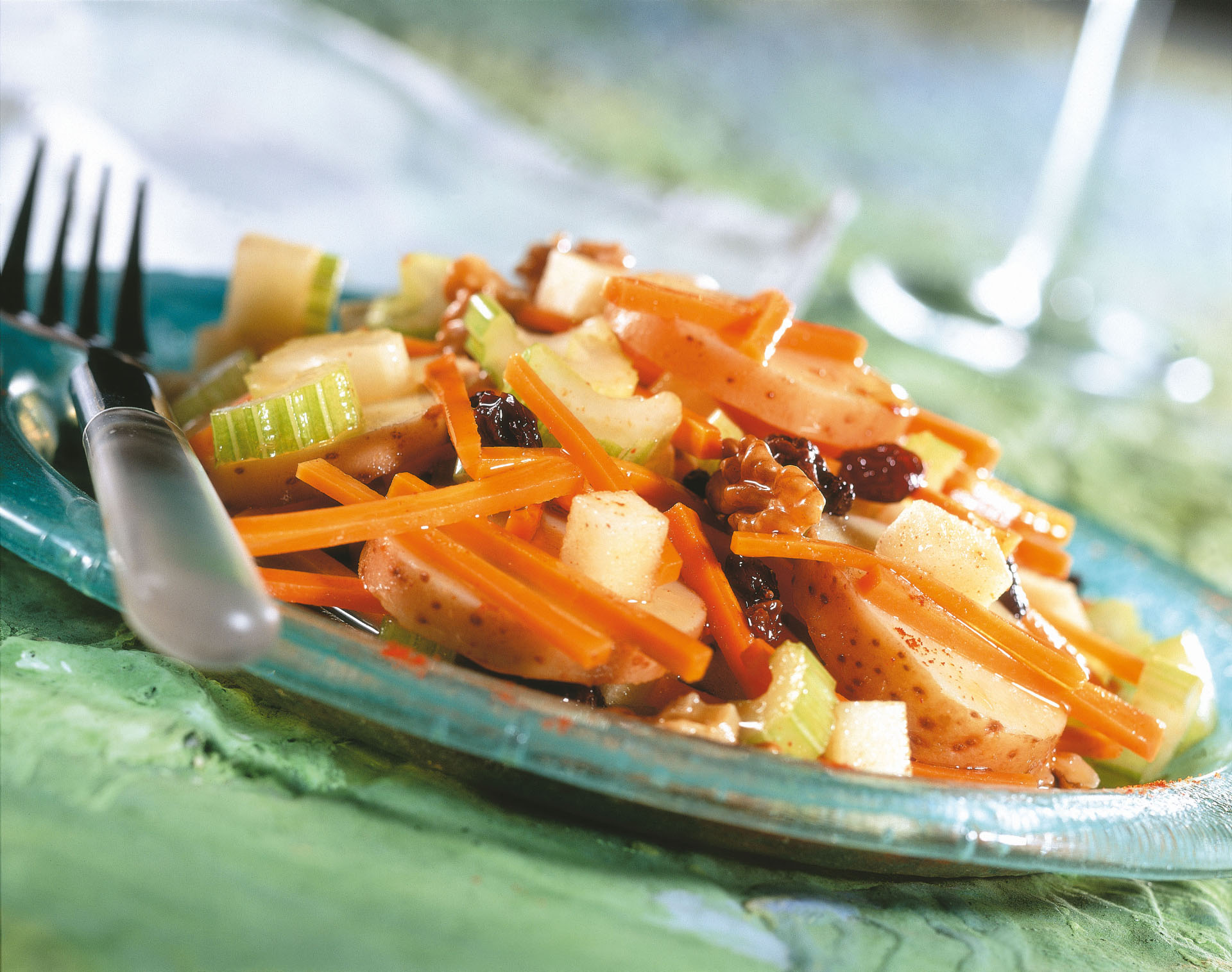 Cocinar las papas cortada en rodajas y las zanahorias en bastones separadamente. Pelar y cortar la manzana en daditos y los tallos blancos de apio en rodajitas.