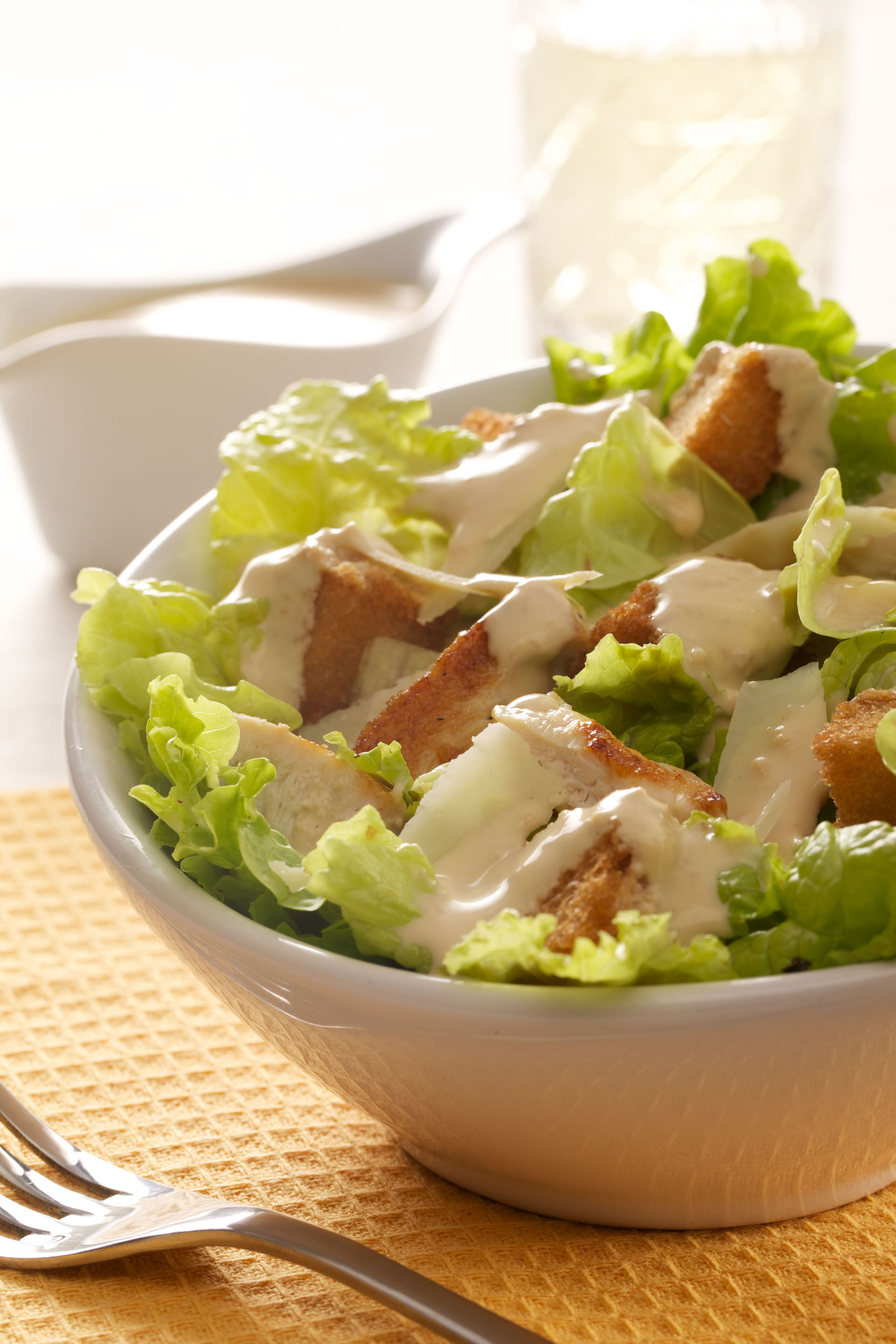 Lavar las hojas de la lechuga, secarlas bien y cortarlas con la mano. Aparte frotar el bowl o ensaladera con el ajo, incorporarle la lechuga, queso parmesano rallado y el aderezo que se habrá preparado mezclando todos los ingredientes de la salsa. Añadir a la base de lechuga y por último antes de servir agregar los croutons tibios.