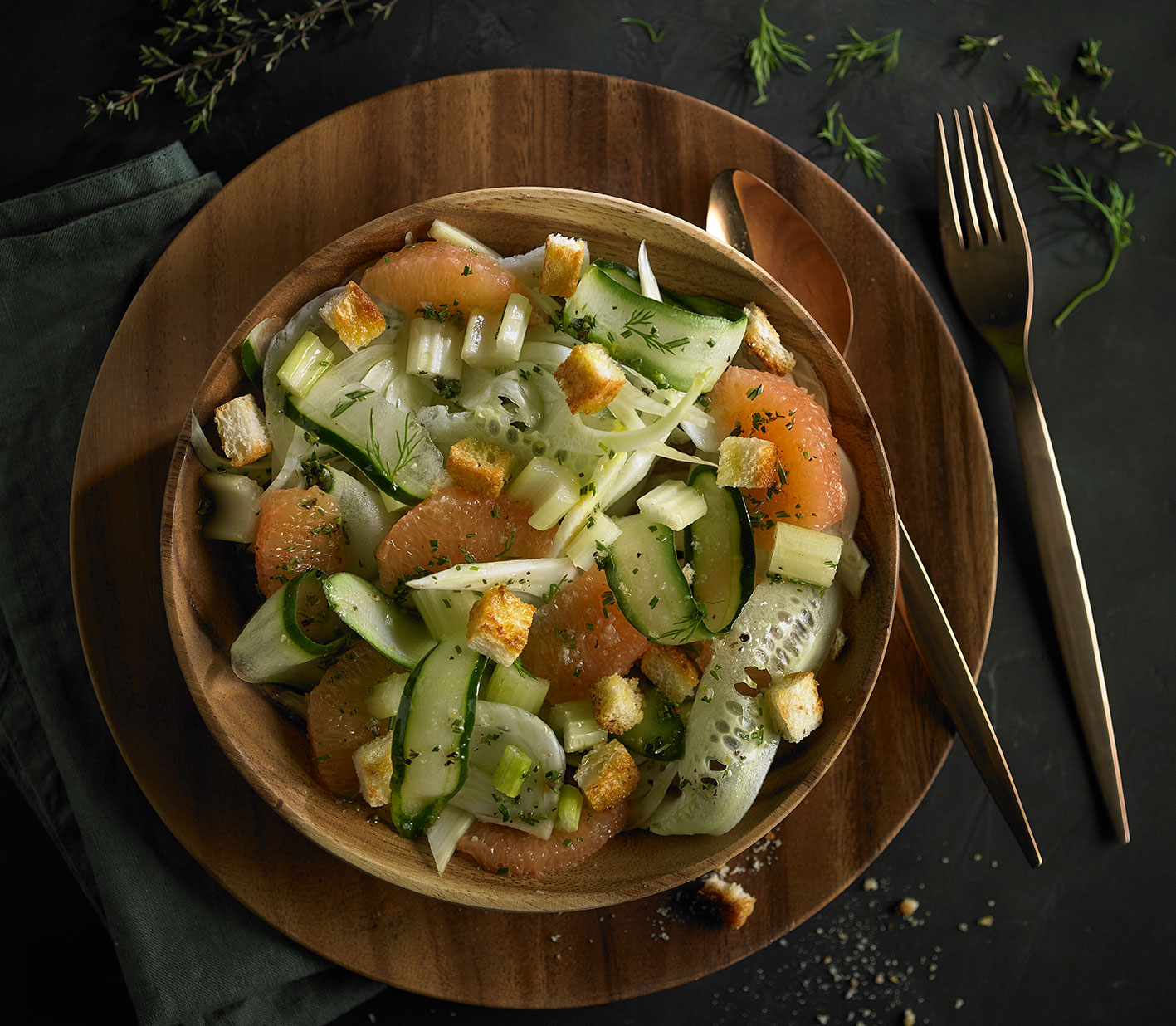 Lavar los vegetales y la fruta. Pelar los pomelos, cortarlos en gajos, retirar bien todos los hollejos y la película de revestimiento del gajo. Despuntar y retirar la parte más externa y fibrosa de los hinojos. Cortarlos en finas láminas. Cortar en cubos las pencas de apio. Pelar los pepinos y cortarlos en rodajas.