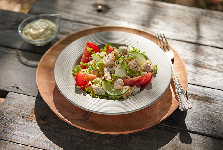 Aparte, calentar el Aceite Blend Natura en una sartén y sellar el pollo todos sus lados. Condimentar con sal y pimienta y cocinar hasta la completa cocción de la carne. Retirar, dejar enfriar, cortar en cubos e incorporarlos al arroz.