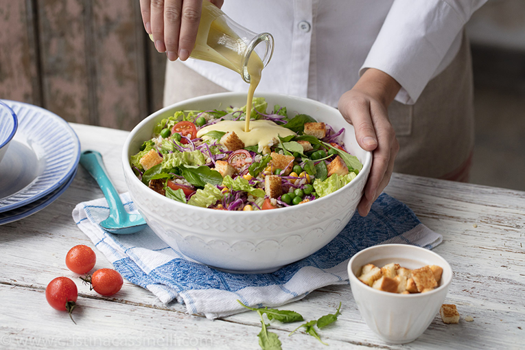 Para el aderezo mezclar en un recipiente el Aceite de Oliva Natura Intenso, la Mayonesa Natura, la Mostaza Natura, el jugo de limón, sal y pimienta a gusto. Reservar.