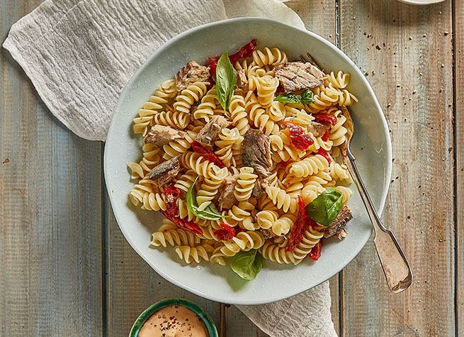 Hervir los fideos en abundante agua con sal, retirarlos al dente, escurrirlos sobre un chorro de agua fría, disponerlos en una fuente, rociarlos con Aceite de Puro Girasol Natura. Añadir la caballa escurrida y desmenuzada junto con los tomates hidratados, mezclar bien. Reservar.