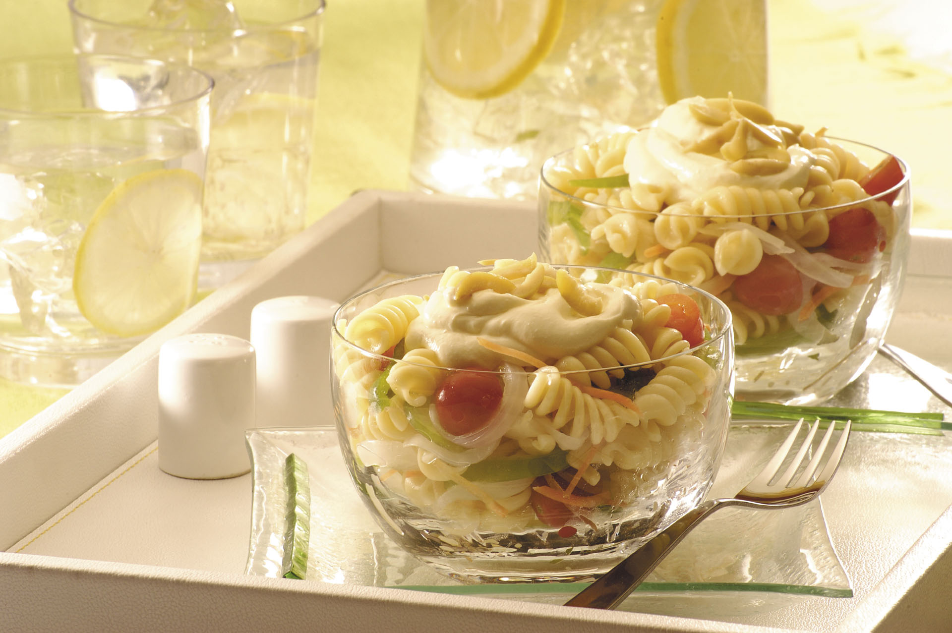 Hervir los fideos en abundante agua con sal, retirarlos al dente, escurrirlos sobre un chorro de agua fría, disponerlos en una fuente y rociarlos con 1 cucharada de Aceite Puro de Girasol Natura.