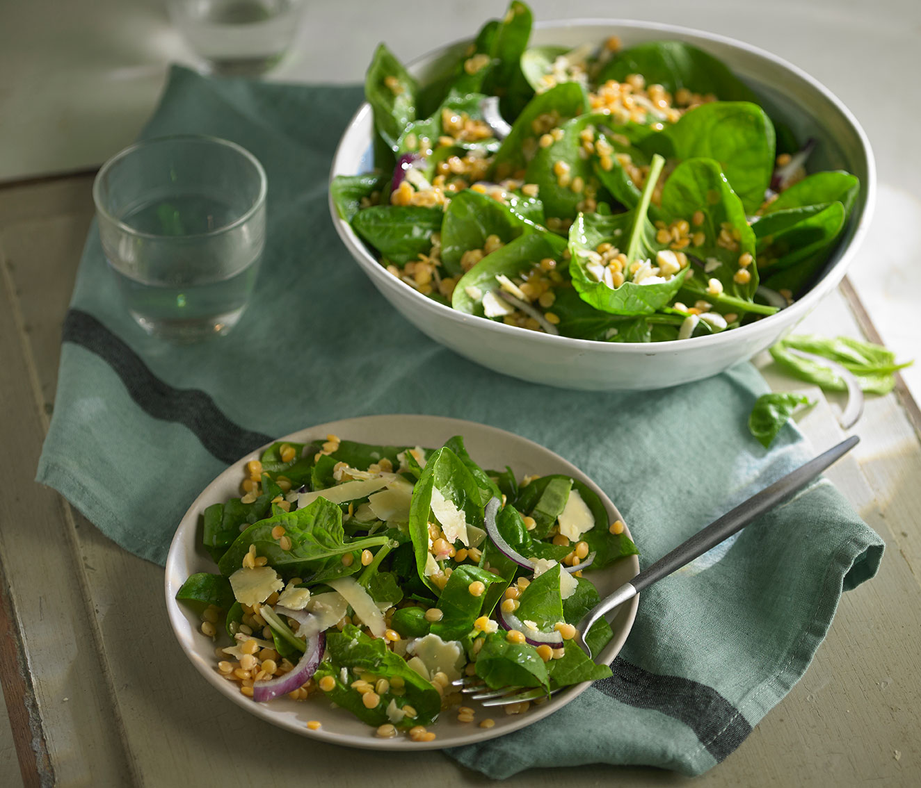 Retirar los tallos a la espinaca, lavar las hojas y escurrirlas bien. En una ensaladera colocar la espinaca fresca y las lentejas. Espolvorear con las láminas de queso parmesano y aderezar con Aceite de Oliva Selección Natura, aceto, sal y pimienta negra molida.