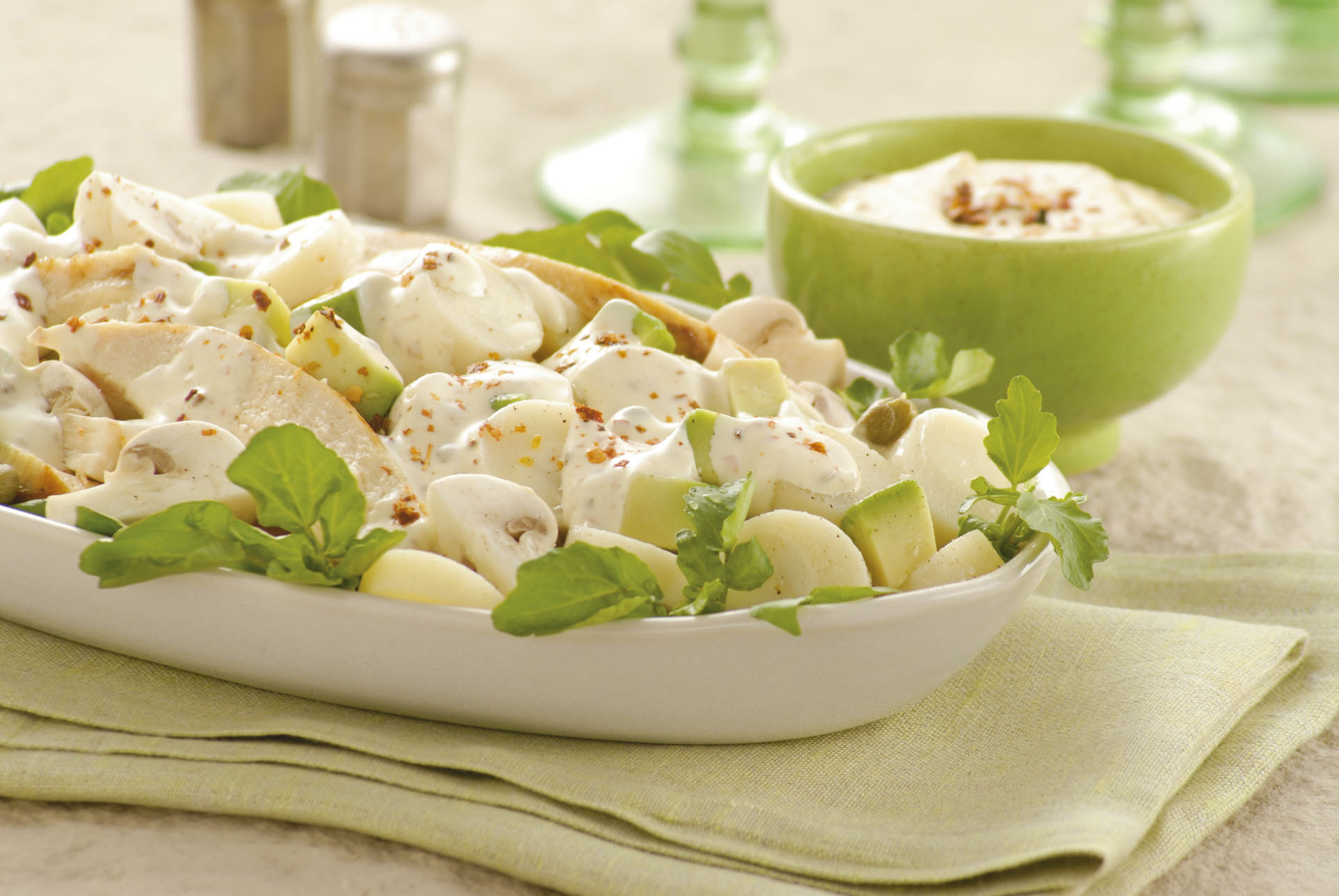 Ensalada de palmitos, pollo y champiñones con mayonesa especiada
