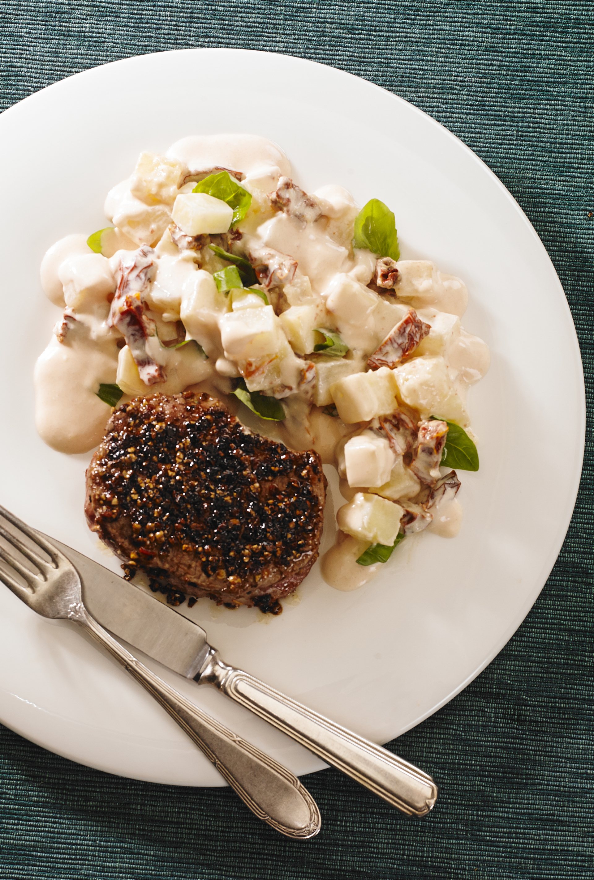Para el aderezo, mezclar en un recipiente el yogur natural o la crema junto con la Salsa Golf Natura. Salpimentar a gusto. Añadir las tiras de tomates secos y las hojas de albahaca ligeramente cortadas. Mezclar bien con las papas y servir como guarnición de carnes rojas.
