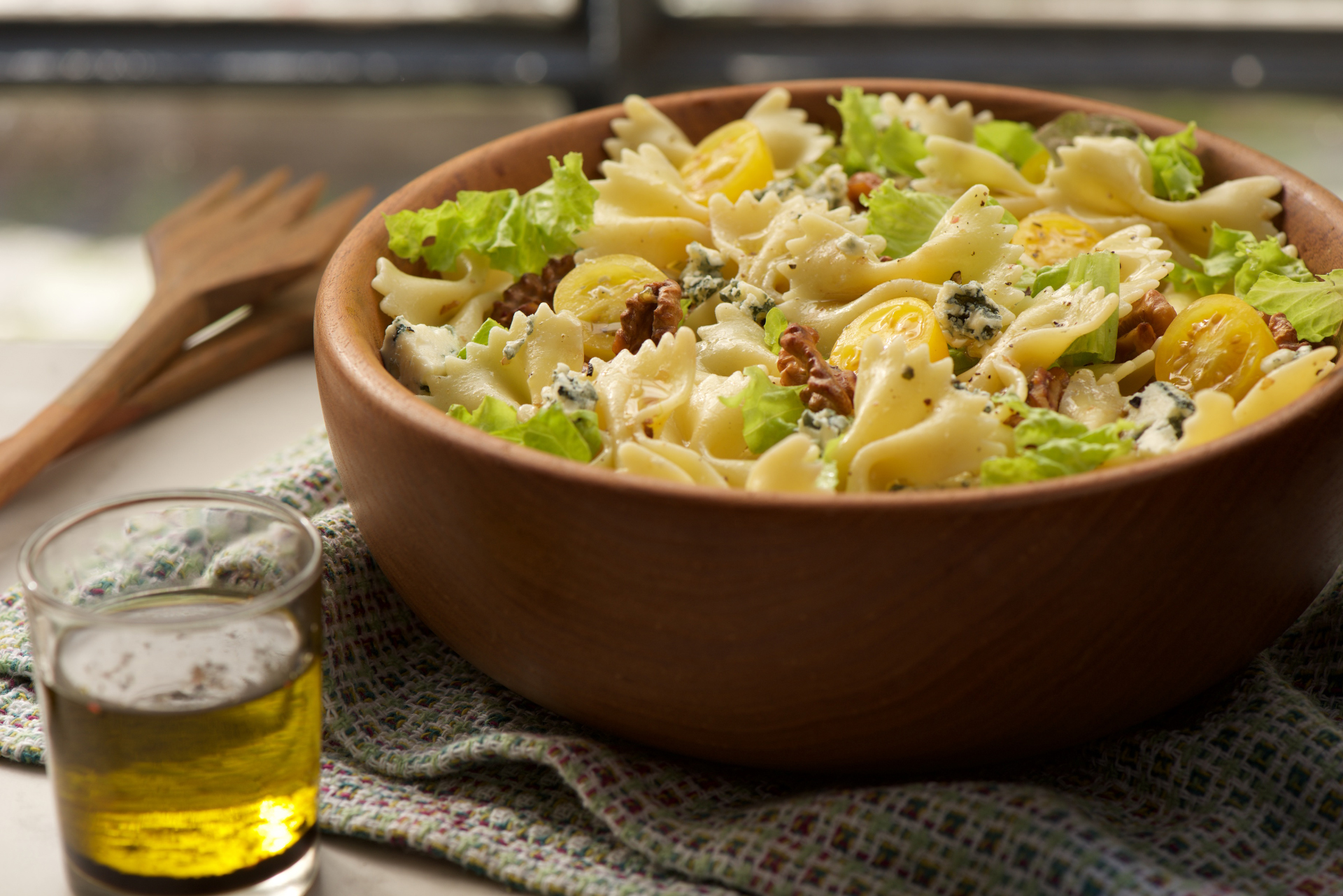 Añadir las hojas de lechuga bien lavadas a la ensaladera junto con la pasta. Incorporar luego el queso azul en dados, las nueces en mitades y los tomates cherry. Mezclar, verter el aliño y continuar mezclando. Servir inmediatamente luego de condimentar.