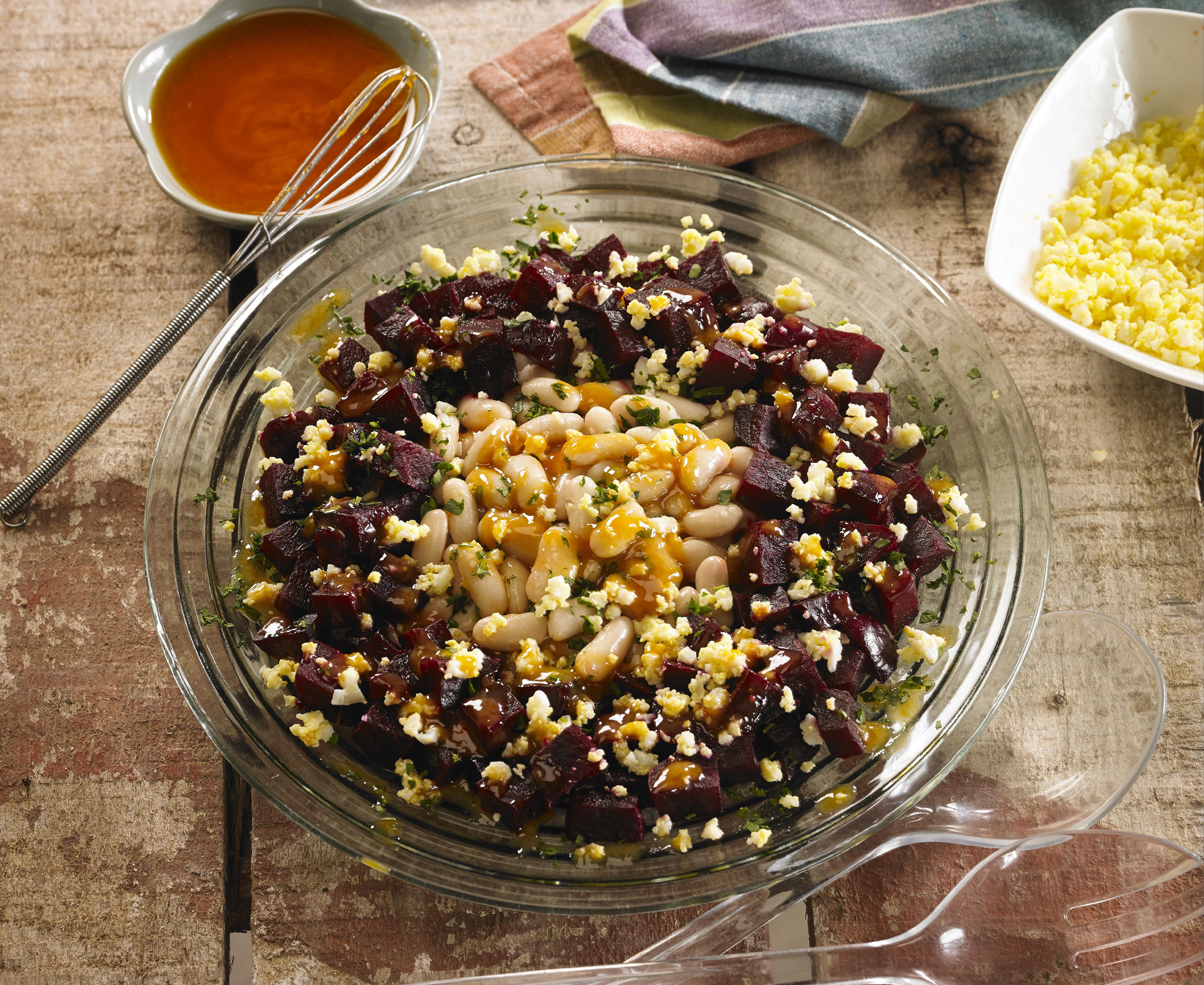 Remojar los porotos en agua y sal por espacio de 3 a 4 horas. Luego hervirlos con abundante agua y sal durante 25 minutos. Escurrirlos y colocarlos en el centro de una fuente. Colocar alrededor las remolachas cocidas en cubitos, espolvorear con perejil y los huevos duros picados.