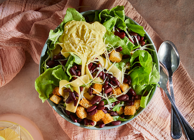 Para el aderezo mezclar bien todos los ingredientes, verter sobre la ensalada y por último antes de servir agregar los croutons reservados.