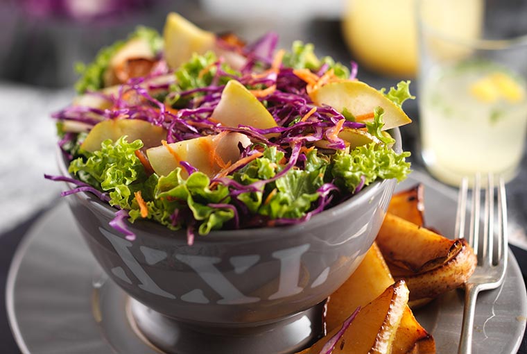 Disponer en una ensaladera baja las hojas de lechuga francesa cubriendo toda la base y distribuir sobre ellas el repollo colorado, la pera, las cebollitas y por último la zanahoria rallada.