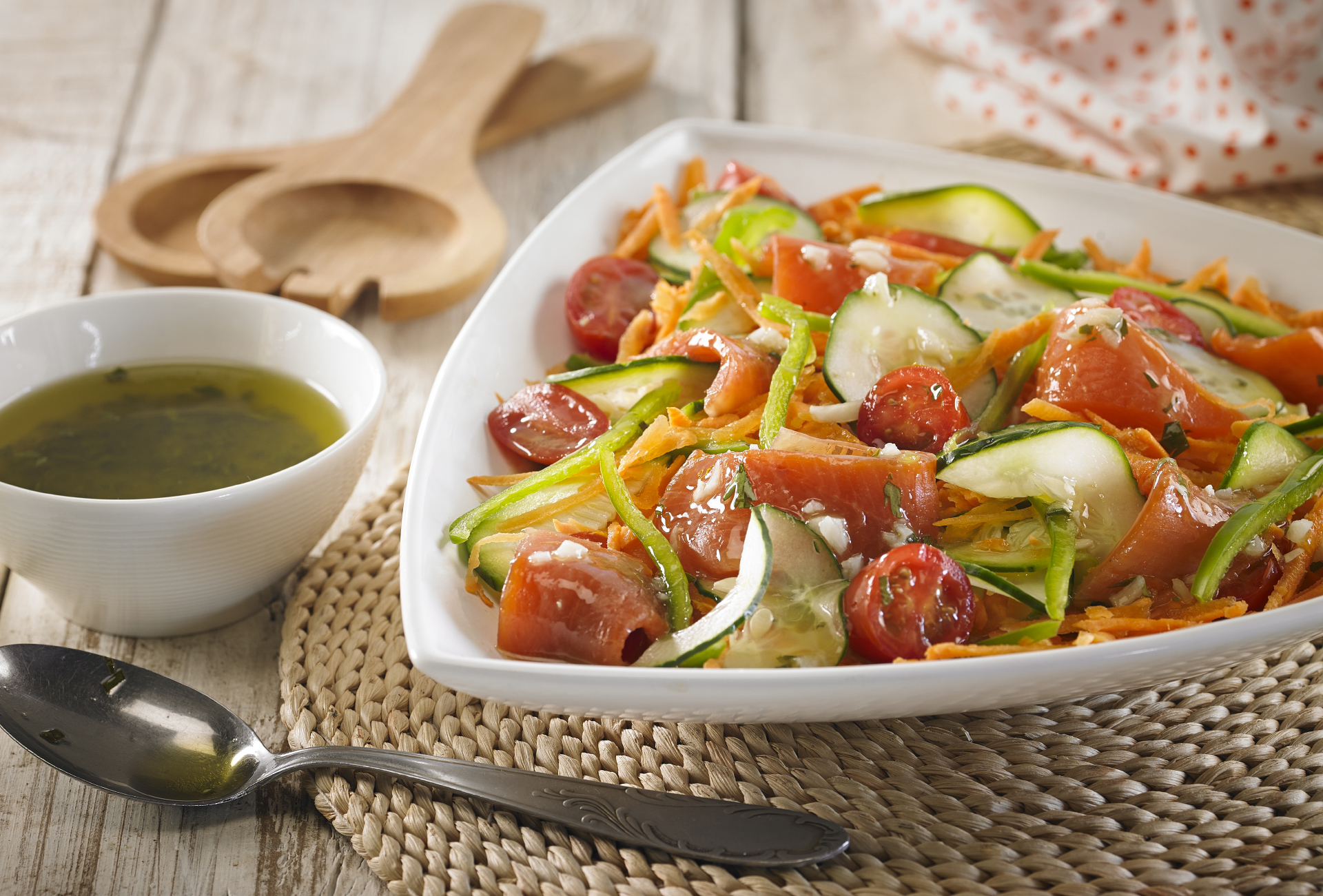 Ensalada de trucha ahumada, hortalizas y aderezo especial