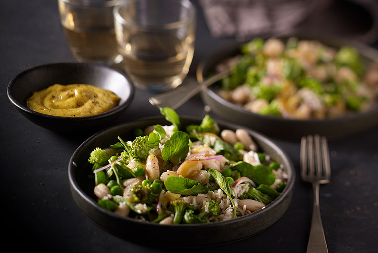 Colocar en una ensaladera los porotos, el arroz integral, las arvejas, el brócoli, los rabanitos y las hojas de berro limpias. Mezclar.