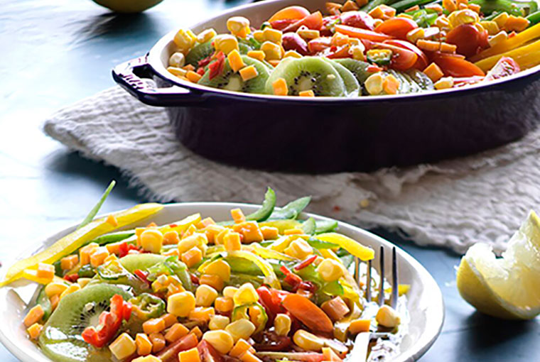 Pelar los kiwis, cortarlos por la mitad y luego en fetas gruesas. Cortar los morrones en juliana, los cherrys en cuatro gajos, el chili en fetas finas y el queso en cubos.