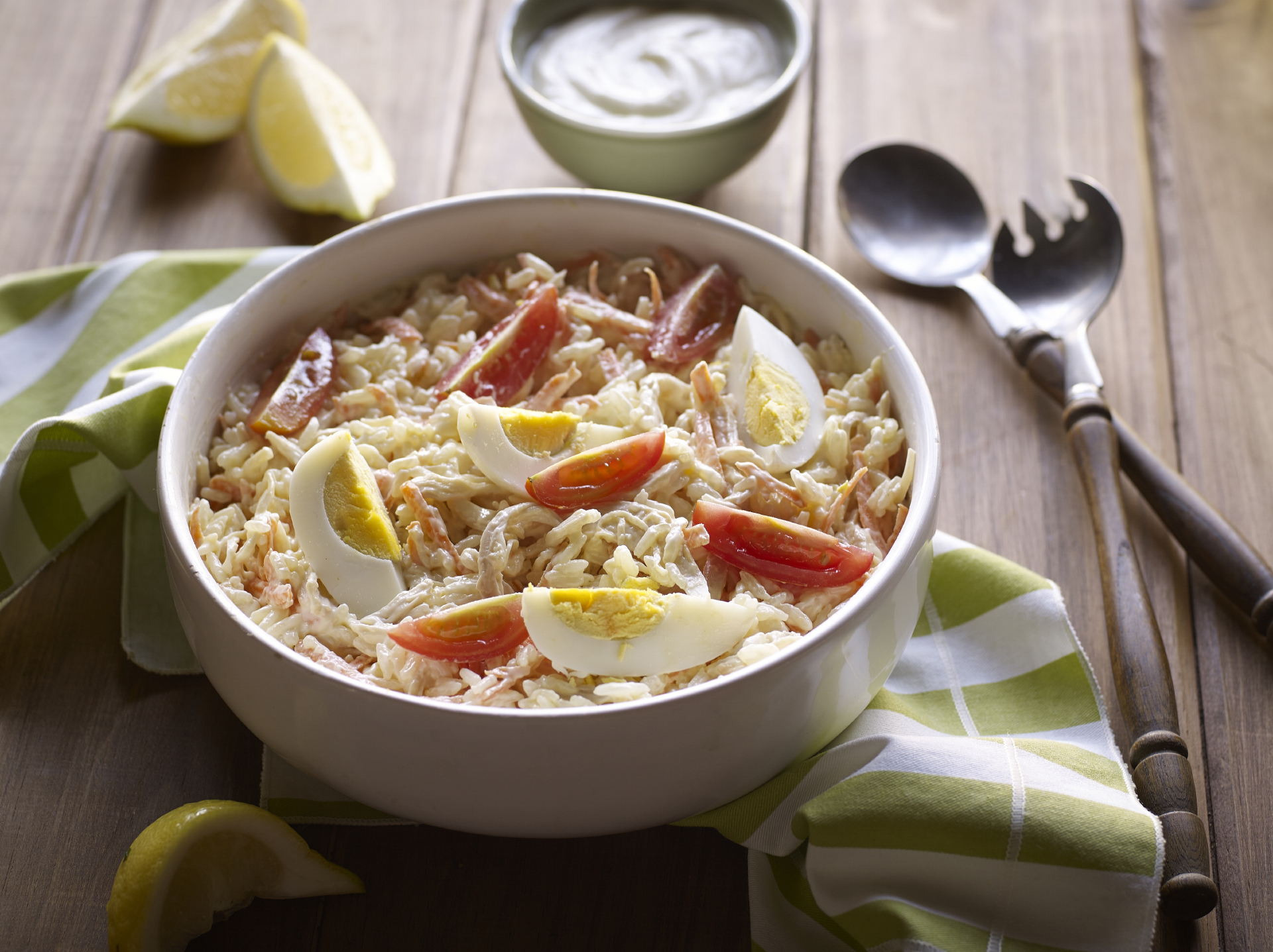 Preparar un aderezo con el queso crema, Mayonesa Natura y un toque a gusto de jugo de limón y verter a la ensalada hasta que se integre bien el aderezo. Acomodar en una fuente y decorar con los huevos duros cortados en rodajas y los tomatitos cherry a los que se les habrá dado un toque de Aceite de Oliva Natura.