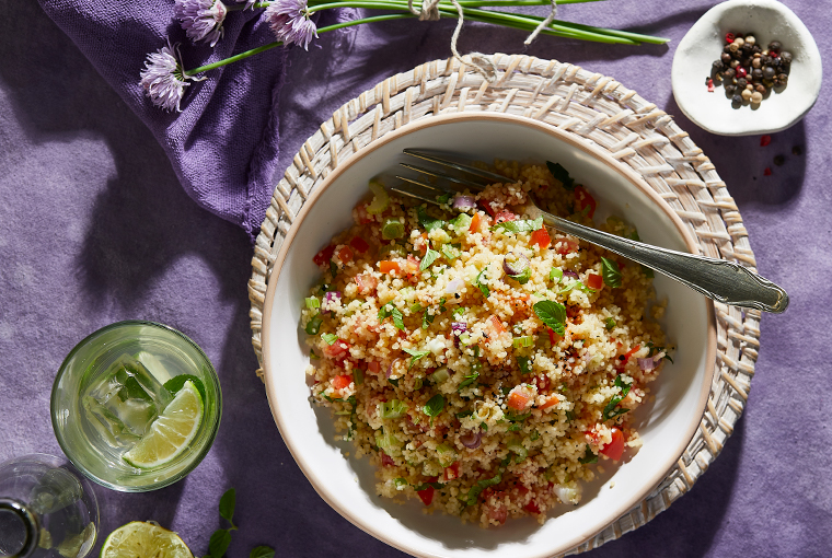 Armar el aliño emulsionando el Aceite de Oliva Intenso Natura, junto con el jugo de limón, la sal, la pimienta y el pimentón. Verter sobre el cuscús y decorar con hojas de menta.