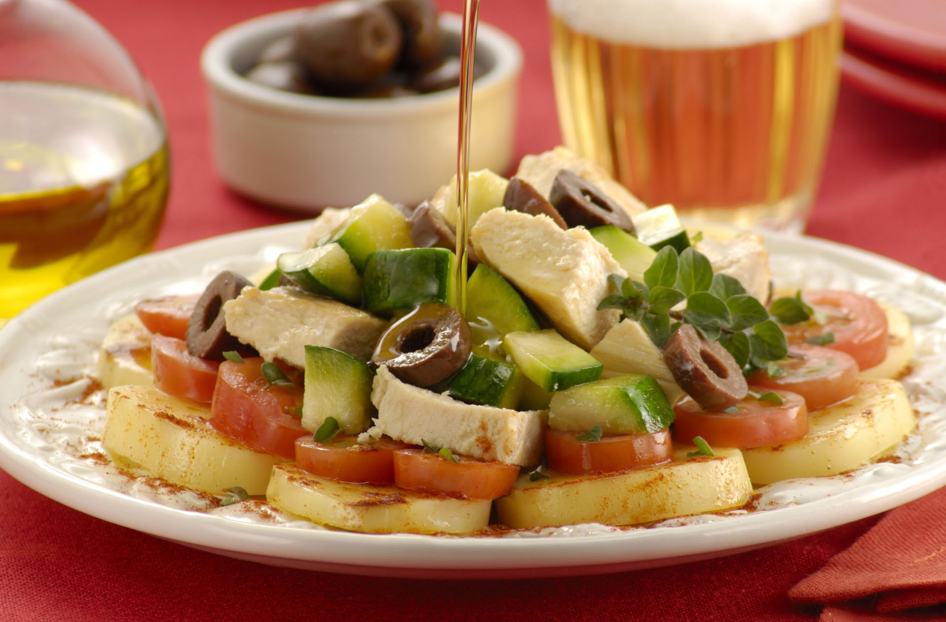 Por último colocar el pollo en el centro de la fuente y rociar toda la ensalada con el Aceite Oliva Virgen Extra Natura restante. Salpimentar a gusto y servir.