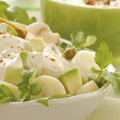 Para el aderezo, mezclar en un bol la Salsa Golf Natura con la crema, el yogur sal y la pimienta. Integrar y reservar.
