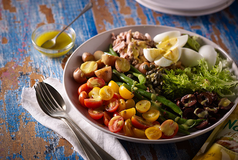 Colocar en una ensaladera grande, las hojas de lechuga limpias, los papines, las chauchas, los tomates cherry en mitades, las alcaparras, las aceitunas negras en mitades, los lomitos de atún, y los huevos duros en rodajas.