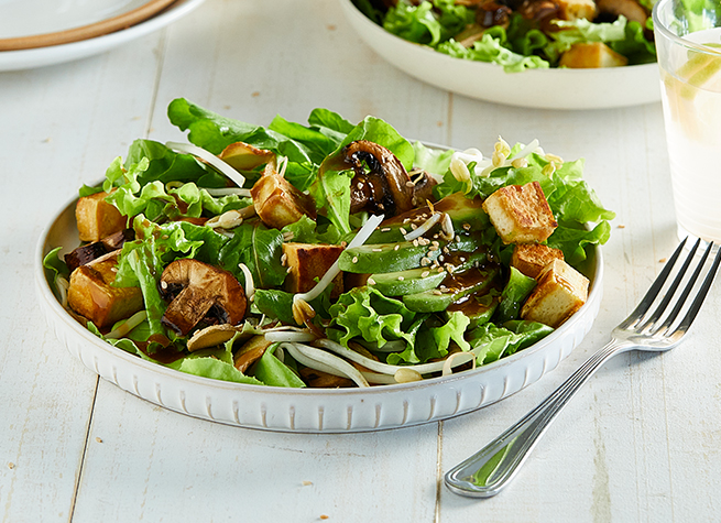 Distribuir los hongos tibios y los cubos de tofu dorados en cada ensaladera. Condimentar con el aderezo agridulce y servir.