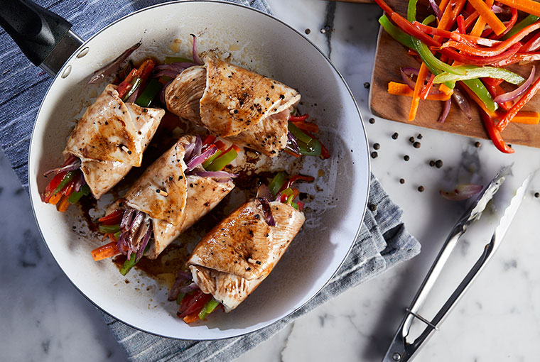 Aparte, condimentar los bifecitos de pollo de ambos lados con la Mostaza Natura y una pizca de pimienta. Disponer un puñado de los vegetales reservados sobre cada bifecito, enrollarlos y cerrarlos con ayuda de escarbadientes.