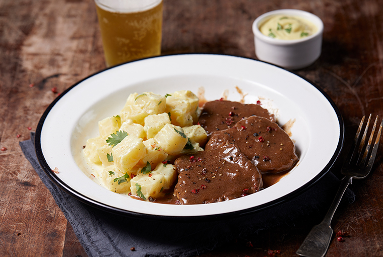 Calentar una sartén, agregar la manteca y el Aceite Puro de Girasol Natura, incorporar los bifes hasta dorar de ambos lados. Agregar el caldo y la cerveza negra, dejar reducir unos minutos e incorporar la cucharada de harina reservada para ayudar a que la salsa ligue.