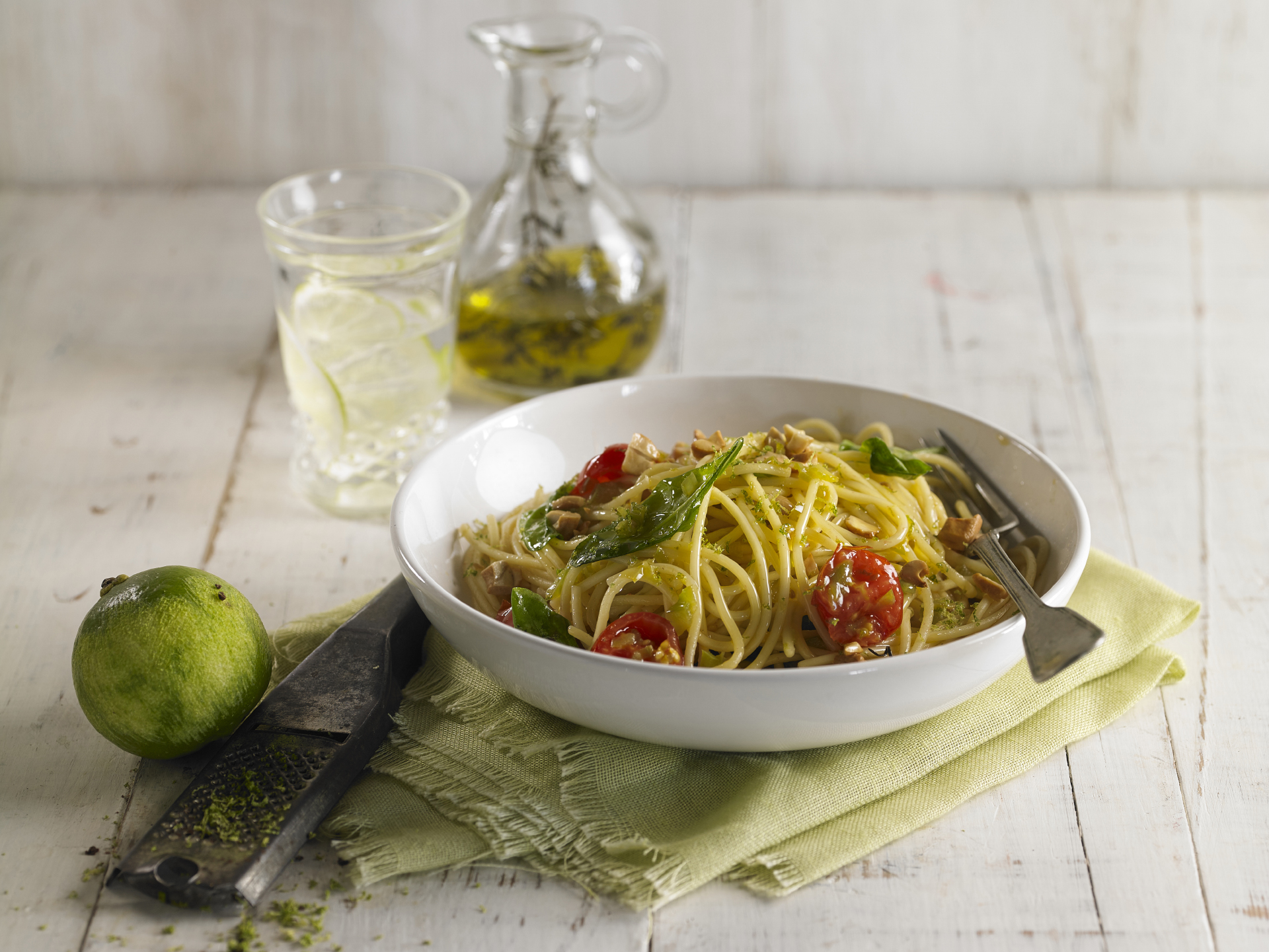 Mientras tanto, calentar en una sartén el Aceite de Oliva Natura junto con los tomates cherry cortados en cuartos y mitades, la ralladura de lima, y el ají morrón picado. Dejar cocinar hasta que los vegetales estén tiernos.
