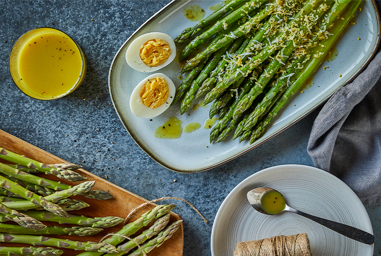 Espolvorear el huevo duro picado encima de los espárragos y verter por encima la vinagreta a la mostaza.