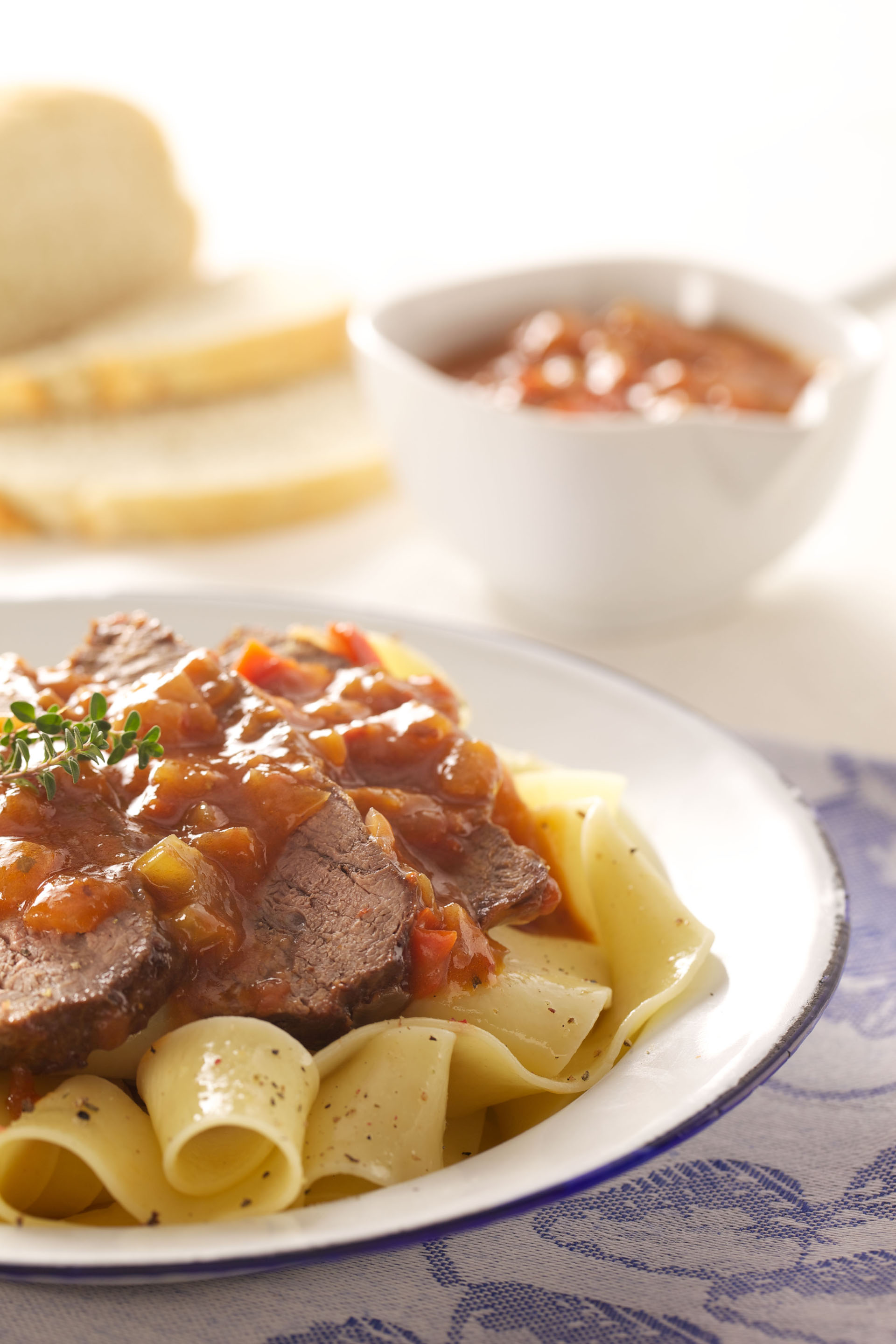 Colocar suficiente agua en una cacerola grande, una vez que comienza a hervir añadir la sal y verter la pasta seca sin cortar. Cocinar hasta que esté al dente. Retirarlos del fuego, colar, refrescar con un chorro de agua fría y disponerlos en una fuente. Verter por encima la salsa con la carne estofada en rodajas. Cubrir con abundante queso rallado y servir bien caliente.